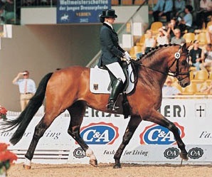 Aboard Birkhof's Alassia FBW, Plaster built up an impressive list of achievements. A 10th place at the Bundeschampionate in 2001 as five-year old, a fourth place at the 2002 Bundeschampionate as six-year old, and a most impressive fifh place at the 2002 World Championships for Young Dressage Horses in the six-year old division.