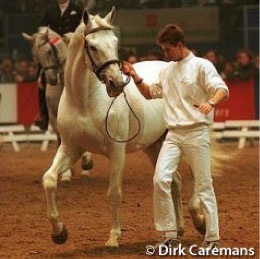 Uniform is a preferent stallion born in 1978. Standing at 16.3 hh the white stud is by Wahtamin out of Liris. Bred and owned by Stoeterij Het Vierspan, Uniform was their foundation stallion bringing the farm wealth, fame and success. Gestion Junior STV is currently making headlines under Dutch prima donna Anky van Grunsven. The pair won the Prix St. Georges test at the CDI-W Malines, Belgium.
