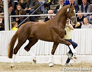 One of those stallions that just takes your breath away was No 40, a son of Belantis – Ampere – Ravallo, who was bred by Thomas Schult and presented in Verden by none other than Isabelle Werth and Mr. Schult in partnership. His 2nd dam also produced the approved Fidertanz. And what a horse this one was! He owned the arena from the first step he took and it was no question that he would be handed a premium title at the end of the show. His impulsion, his sense of self-carriage and the way he always worked under his center of gravity were quite amazing. The plan for him actually includes a 2-year breeding contract before he begins his sport career. After he was gone, we all had to literally try and focus on the next horse, so lasting were the impressions from No. 40.