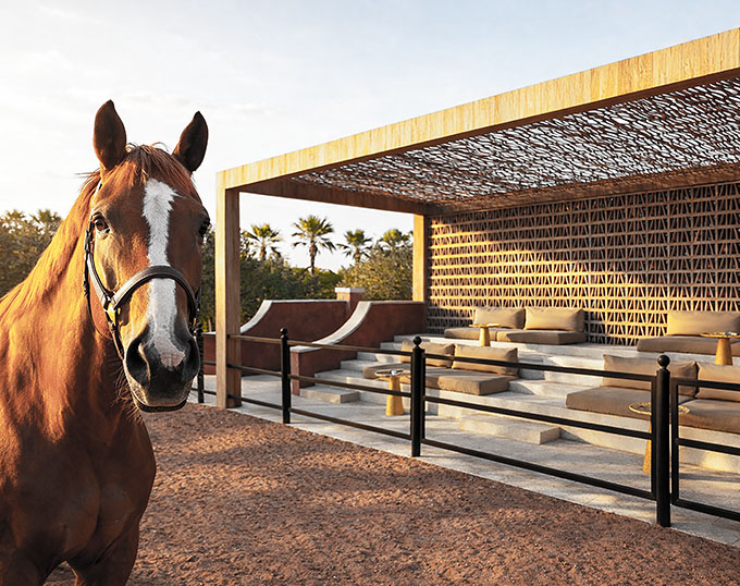Equestrian elements are reimagined: tack rooms become intimate salons, water basins evolve into contemplative courtyards, pathways blur the boundary between stable and sanctuary.