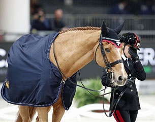 In a special three-rider dressage demo, Truppa and Chablis were final pair to go on Saturday night 28 October 2017. They performed a freestyle to music, after which Chablis's tack was removed and a special retirement cooler put on after which they left the arena.
