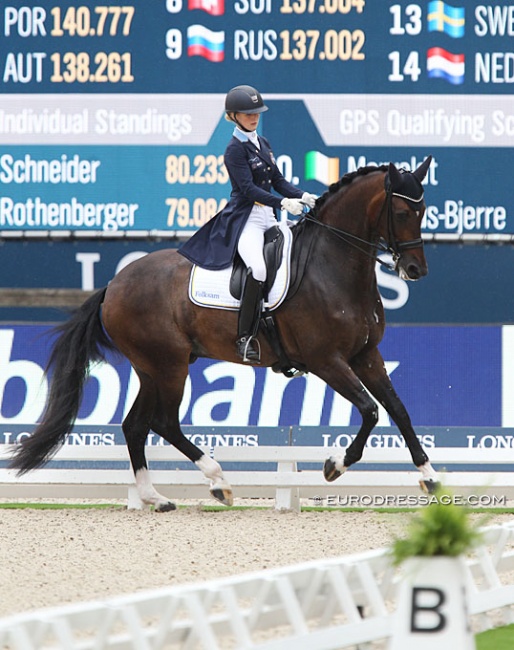 Along the short side, the judges get a good look at the horse. They can easily see the correctness of the frame and the engagement. Be aware of this as a rider and show him off on the short side. Is the poll the highest point? Is the nose in front of the vertical? Notice the rhythm and the cadence. Make the rhythm and cadence the best it can be. You can press him forward a little as you come out of the corner and half halt over the centreline, press him out a little again. On the short side check your horses straightness.