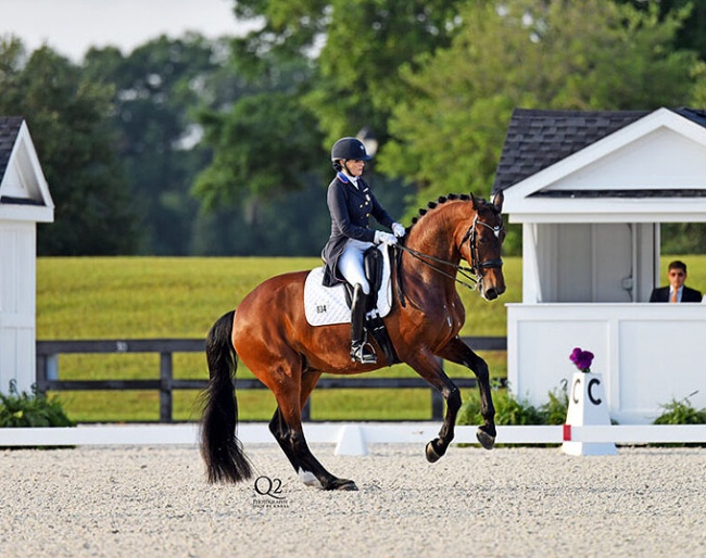 Denielle Gallagher (CAN) and Come Back de Massa, an 11-year-old Pure Race Lusitano gelding by Galopin de la Font x Quixote SDS owned by Gallagher and Ellen Lazarus, were second with 69.020% in the Inter A. Jennifer Williams (USA) rode Quantaris, a 12-year-old Oldenburg gelding by Quarterline x Sir Donnerhall owned by Oded Shimoni, to third place and 68.833%.