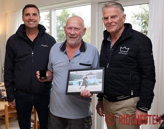 Jan Pedersen, president of the Danish Warmblood society, and Andreas Helgstrand, who produced the mare to Grand Prix level, visited Gosmer at home to present him with the medal.