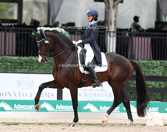 An interesting horse to watch was Canadian Olympian Naima Moreira Laliberté's 13-year old KWPN gelding Inspire (by Vitalis x Johnson) who ended up almost at the bottom of the leaderboard (61.196%) due to mistakes, but that didn't make him less intriguing. Although the horse clearly lacked bend and elasticity to the left, he had highlights in the first piaffe and straight one tempi changes. A total refusal to do the second piaffe as well as the passagey right trot half pass made the score plummet. Naima trains with Ashley Holzer while in Florida.