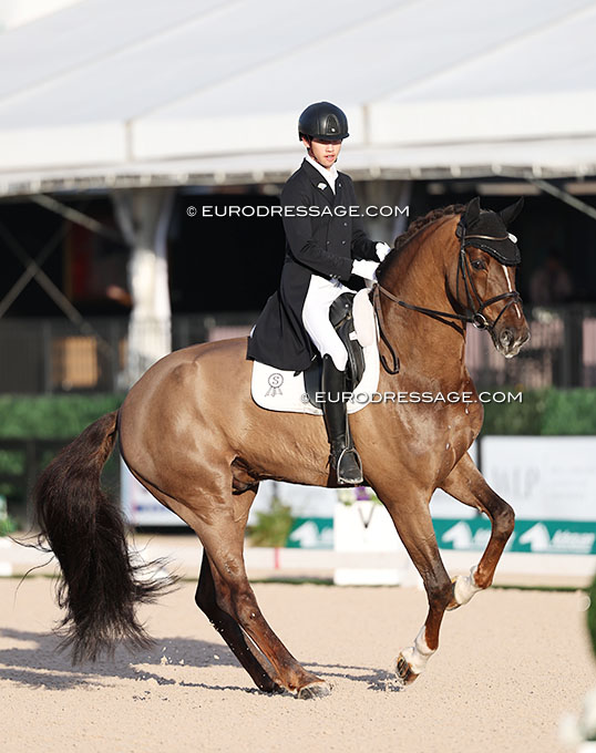 It was a nice welcome back for Fashion Prinz OLD, the now 9-year old Oldenburg by Furst Romancier x Sarkozy who was fourth at the 2021 Bundeschampionate and won bronze at the 2022 World Young Horse Championships under Frederic Wandres. Owned by Hof Kasselmann, the tall liver chestnut sold for 750,000 euro to the American Houston family at the 2021 PSI Auction, but the horse stayed in Kasselmann's training programme and was shown by Annika Feldhaus and Valentin Munkedal between 2023 and 2025. He re-sold to Chinese Xiao Weilin for Zhanzhoa Giu to ride as 2026 Asian Games hopeful. They scored 66.647% for fourth place.