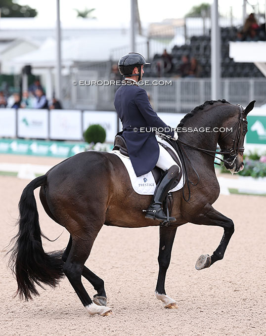 Israeli Micah Deligdish has a super cute new Grand Prix horse to ride, the 14-year old Lusitano Carpe Diem de Massa (by Maestro x Violino SS). The chunky grey has a really nice piaffe-passge and once again the Lusitanos (and PRE's) are shown to be favoured for their rideability and manageability at Grand Prix level by aspiring big tour riders.