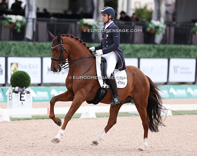 The class kicked off with a bang as American Jordan LaPlaca had his international Grand Prix debut aboard the 11-year old Oldenburg Gold Play (by Grey Flanell x Sir Donnerhall II), a horse Eurodressage spotted in the national ring last year and marked as one to watch for the future of U.S. Dressage. The pair showed great promise and quality in the piaffe and passage but the rhythm was not as crisp yet. The trot work needed to be a bit more over the back. Not sure if it was stage fright or just inexperience but in the canter work the movements all felt quite braced and "held", just like the final trot extensions. One could easily see that the ingredients were all there, but the execution was not. A 66,891% as first international score was not too bad at all.