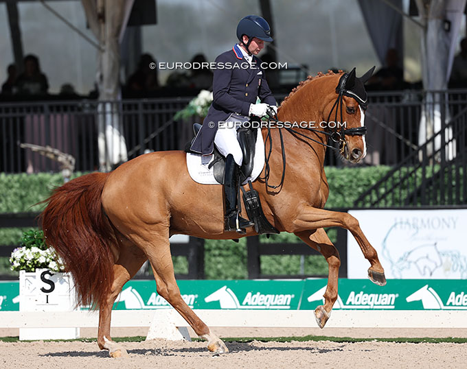 Kevin Kohmann and FamousKevin Kohmann has an awesome new ride in his client Tarryn Hartnett and Avery Chapman's horse Famous, an already 15-year old Hanoverian by Floriscount x Wolkentanz that has competed in Germany with Alexandra Hidien, Louisa Deutschbauer and Ann-Christin Wienkamp. The chestnut is another super piaffe and passing horse with uphill tempi changes, but he could be a bit less hand-held and more chewing in the contact. They were second with 68.326%.