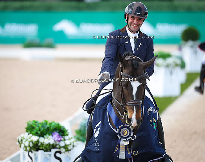 Fortunately the Grand Prix saw 22 entries split over two classes and those classes were very interesting to watch. In the Grand Prix for Special one of America's most exciting rising pairs - Jordan LaPlaca on the 11-year old Oldenburg Gold Play (by Grey Flanell x Sir Donnerhall II) - rode their second ever international Grand Prix test and won with 68.913%. The horse has a little bit of a sunken back but has a gorgeous piaffe and passage. He could have been a bit more straigh and elastic on both reins, often flexed to the right, but the win was deserved and the judges' score rather conservative. That could easily have cracked 70%, although two on the panel of five (Rodriguez - Wüst - Max-Theurer - Voser - Gonçalves) had them at 70%. What is unknown by the judges is treated conservatively.. nil novum sub solem.