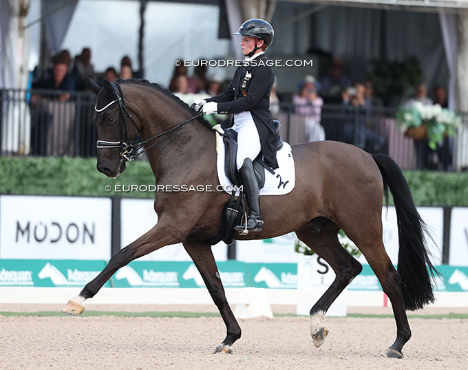British Susan Pape and the 15-year old KWPN mare Giulilanta (by Jazz x Flemmingh) landed fourth place wit 70.696%. The passage and one tempi changes were the highlights of the test, but overall the chestnut mare appeared strong in the contact and tense in the piaffes today.