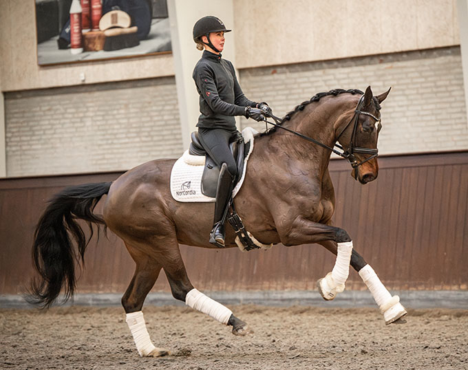 Grevens Zeze is easy and enjoyable to ride, offering a rare combination of quality, willingness, and an uncomplicated temperament. She is also straightforward and easy to handle in daily management, making her a very suitable junior horse, as well as an ideal prospect for the professional rider looking to develop a top horse for the future.