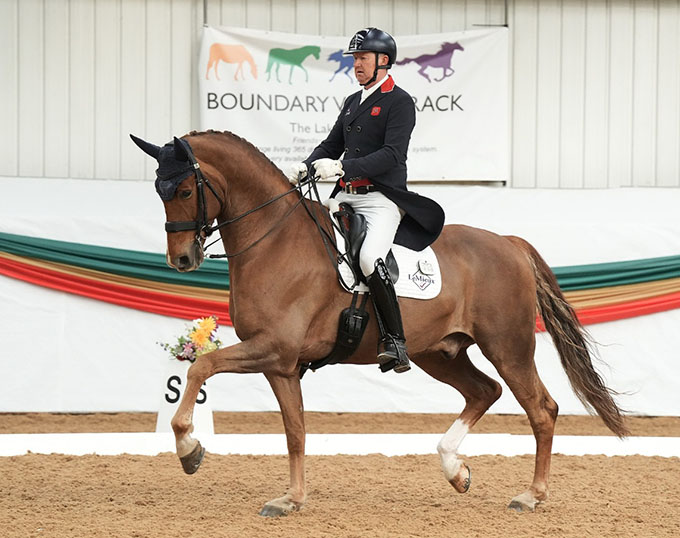 Irish country mate and national dressage champion Kevin Acres has started his campaign for the Minimum Eligibility Score (2x 66%) to qualify for the 2026 World Championships in Aachen. Aboard the 15-year old KWPN bred Ganesh (by Jazz x Partout) he rode his first international again after a three-year break from CDI showing. In Hartpury they were 7th with 65.870%.