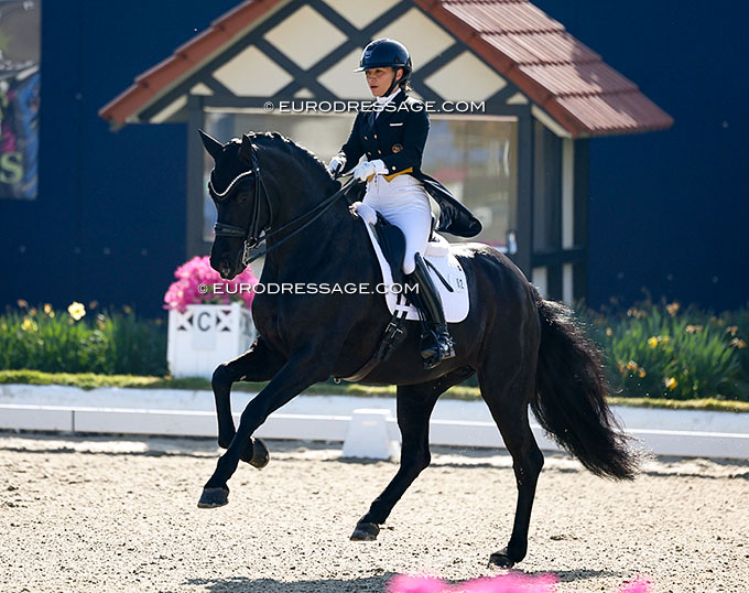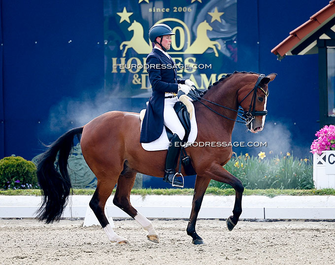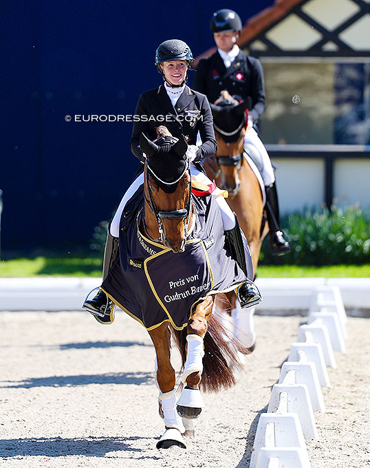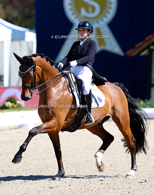 The winner of the Grand Prix - Charlott Maria Schürmann and the 11-year old Oldenburg mare Dante's Pearl OLD (by Dante Weltino x San Amour) - lived up to the expectations in their first season at international Grand Prix level. The duo began their Special test with a square but stretched halt and huge crossing in the sweeping trot half passes. The passage was so lovely although the regularity still needs to improve with the left hindleg generating more suspension and airtime when it's off the ground. The mare ground her teeth audibly, which shows that the task is quite strenuous for her at this point in her training. In the trot extensions she also needs to lengthen the frame and not just the stride, the second piaffe was slightly forward and in piaffe she still leans a bit on the shoulders but shows great promise. The mare dropped into trot in the corner before turning on the centerline for the pirouettes but that did not affect the score. She showed good ability to collect. Schurmann and Dante's Pearl, who is owned by the Scheufele family known for the luxury brand Chopard, scored 75.553% % to win the Special after being victorious in the Grand Prix with 73.652%. Particularly that 75% score is a clear knock on the door for that fourth team sport consideration (alongside Werth/Wendy - Wandres/Bluetooth - Hemmer/Denoix). Schurmann is currently getting coached by German based Spaniard Santiago Damil.