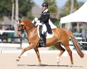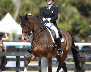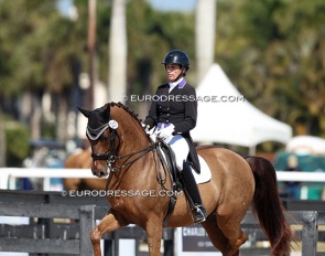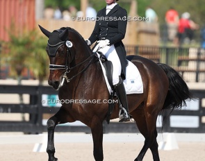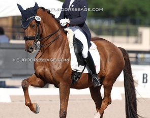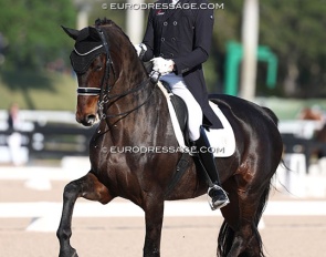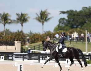 Dawn White-'o Connor on Akiko Yamazaki's Hexagons Leon (by Ferdinand x Rubiquil). Test appeared over collected and horse kicked to the spur a few times, but he definitely has it all to be a great Grand Prix horse