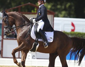 Isabell Werth on Emilio (by Ehrenpreis x Cacir AA). They won the warm up round but dropped to 9th place in the finals. Emilio is out of the same dam line as Bella Rose