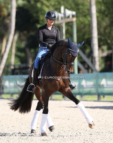 I keep an eye on horses that are purchased in Europe and begin a new life in the States under different riders. Have they progressed? How are they doing? How do they look? There were many familiar faces this weekend, including for instance 16-year old Eye Catcher (by Vivaldi x Partout) who had several European riders before such as Kirsten Brouwer, Emma Kanerva and Alexander Helgstrand before finding a forever home on American soil. Coached by Susan Pape, Donja KWG (by For Romance x Samarant) gave her new owner and rider Denise Steele some small tour mileage. Her husband Ken rode Pape's former CDI horse Bourani (by Belissimo x Davignon). Callie O'Connell has a good successor for Eaton in the 8-year old Franky di Fonteabeti (by Franklin x Wynton)