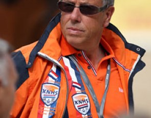Danish pony team trainer Jette Nevermann talking to Danish junior/young riders team trainer Ulrik Sorensen