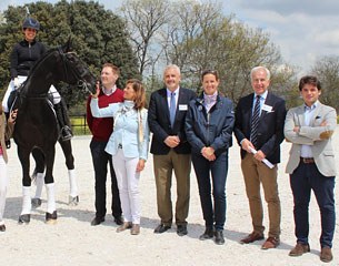 Marta Peña in the saddle of Silver Black OLD, Marcus Busch, Ute von Platen, Juan Carlos Campos, Nicole Uphoff-Selke, Thomas Rhinow and Amador Alsonso at the 2016 Oldenburg Dressage Symposium :: Photo © Top Iberian