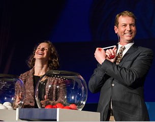 Judy Reynolds and Carl Hester do the dressage draw at the 2017 World Cup Finals :: Photo © Cara Grimshaw