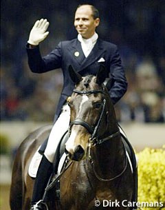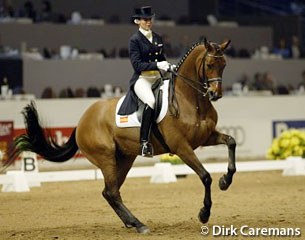 In a disappointedly fourth position came Dutch Arjen Teeuwissen. That Gestion Goliath T is one of the best dressage horses in the world, is without a doubt, but that rider Arjen Teeuwissen does not make a beautiful pair with his bay gelding is obvious too. The large Dutch rider is not delicate with his hand, nor leg aids. His freestyle started off at a high level, but the constant piaffe-passage reprise -- although it is Goliath's fortitude -- became boring in his mediocre freestyle. The canter zig-zag was untidy and Goliath regularly got leaned against the bit. 76.46% was the final judgment of the jury, which placed them fourth.