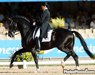 Two American riders entered the arena and both ranked in the top five, venging the 9/11-jinx. Debbie McDonald scored a phenomenal 74.640% aboard her brilliant Brentina and finished second. Her ride with Perry Thomas' chestnut Hanoverian mare was sensational. Although she labelled her test as "conservative", it made a definite impression on every spectator. Fluent transitions, sharp on the letter, a harmonious conversation between rider and horse. As usual, Brentina thrilled with her half passes and eye catching piaffe-passage transitions.