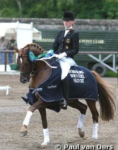 With overwhelming dominance did German Katharina Winkelhues win the 2003 European Pony Championships Dressage at Necarne Castle in Irvinestown, Ireland. Riding her steady partner of three years, the liver chestnut Dressman, Winkelhues rode record scores in the "walled garden" ring at the Euro Championships. Winning all three classes with respected magical scores of 74.89%, 76.06% and 76.04%, Winkelhues was untouchable and took home her fourth golden medal and her second individual title.