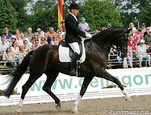 In the Finals, Hennessy ran a bit out of steam even though he remained rhythmical and loose through the back in the trot. His walk was well ridden, but could come more out the shoulder. The canter was adequately uphill, but should be more groundcovering. Nick van Laer and Hennessy scored 7.72 and placed twelfth in the finals. "It was a long journey for Hennessy," owner Jean van Laer told Eurodressage afterwards. "The weekend before Verden, he became Belgian LRV Young Horse Champion and on the way to Verden we were in a traffic jam and it took us 8,5 hours to get there. By Sunday, Hennessy was tired."