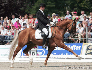 Judge Stephen Clarke praised Alabastro's absolute regularity and good impulsion in the trot with the medium and extended trot as highlights of the test (this horse performed the best trot extensions of all competing horses in the World Championships). The walk was not totally clear on the 1st diagonal but improved on the second. The canter showed much energy and expression. While in the first round, Alabastro was a bit dead in the mouth, his submission in the consolation finals was far better and he moved confidently and powerfully forwards. The horse's scores were 8.7 for trot, 7.0 for walk, 8.4 for canter, 8.0 for submission and 8.1 for general impression. The total of 8.04 placed them at the top!