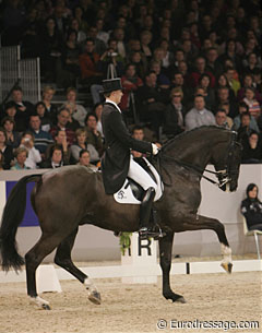 Dutch Laurens van Lieren finished sixth with his father's and Wim Zegwaard's Dutch warmblood gelding Hexagons Ollright (by Rubiquil). The young duo put down wonderful piaffe passage reprises where the horse kept the rhythm very well but tended to go a little deep in the piaffe. They clocked of long series of tempi changes with ones and two tempi's on the circle line. Their music featuring Queen's "Another One Bites the Dust" and "We Will Rock You" put a good beat in their ride. They scored 76.100%, their best score of the season so far.