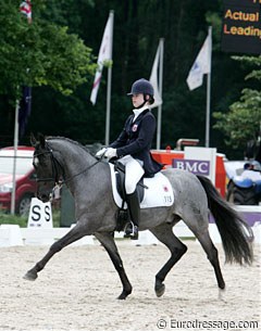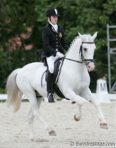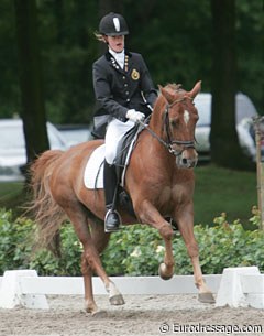 In the autumn of 2007, Maria van den Dungen purchased Sanneke Rothenberger's second pony Dino P (pictured right) and has taken over the ride on the German Reitpony gelding with great success. The pair has been scoring consistent 70% marks and is one of Europe's top combination at the moment. In the team and individual test, Van den Dungen placed second with only a few fractions of points behind Te Riele. In the Kur to Music, however, Dino P spooked from the music and became very tense. Van den Dungen bravely completed her test but placed 9th. Aboard her second pony Pan Tau B, Maria placed second in the consolation finals. With this black stallion she became the 2008 Dutch Indoor Pony Champion and she is currently in the lead with him in the 2008 Imperial Cup, a special show circuit in The Netherlands for FEI Dressage Ponies.