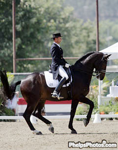 The Wellington, FL pair have a sparkling resume including the 2007 USEF National Developing Horse Dressage Championship for 7-9 year olds. The now 8-year-old Oldenburg stallion showed maturity beyond his years through out the test today and stayed ahead of his arch rival (and reserve champion in the Developing Horse Championship last year): Come On III. Come On III, ridden by Shawna Harding, is more experienced than the lightly shown Don Angelo having won 10 classes in Florida this winter. He is incredibly consistent and Harding and Gibson are very good friends and help each other regularly, despite the fact that they are fierce competitors.