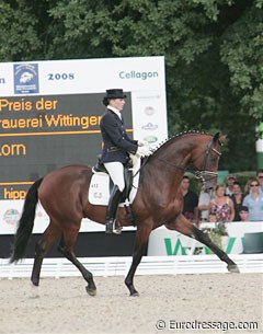 Fiebelkorn and Imperio's partnership is also brand new but led straight to success. "I have him in training since the beginning of 2008. I saw him at the 2007 Trakehner Championships where I was invited as a guest judge rider. Straight away I scored him 10 for rideability," Fiebelkorn said. "I was totally crazy about him and got to ride him for his owner, Mr. Poll of Gestüt Hörum. I have so much fun with this horse." Imperio was the reserve champion of the Trakehner Licensing and partly sold by Poll to Schwaigänger.