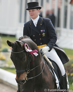 The Belgian Delphine Meiresonne, who was the 1997 European Pony Champion with Noble Casper, has finally returned to the international show ring with the 10-year old Belgian warmblood gelding Wipsy van 't Heihof (by Flemmingh x Saygon). The bay gelding has absolutely stunning gaits and in moments of relaxation a truly brilliant trot shone through, but the gelding was extremey spooky and tense to finish any higher than 64.053%.