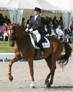 The Germans seem to have set their hope on Matthias Alexander Rath as reinforcing the current Olympic team of Werth, Kemmer and Capellmann. With the super talented Sterntaler Unicef, they hope he'll come of age. The Oldenburg gelding by Sion has a forté: the extensions in walk and trot, but there are numerous training issues that meddle with the harmonious picture. One year ago, Rath and Sterntaler made their show debut in Hagen and it was interesting to see how much they had progressed.