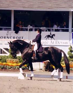 Kelly's next aim was to get her black beauty the next step up the ladder and compete at Intermediaire I level. In 1996 she worked on Andy's strength the entire year and didn't start him. The time spent and the energy saved were well worth as 1997 became a special year for this remarkable pair. Andy made his debut at Inter I and did it in a very successful way by placing 125th out of 446 competitors nationally at this high level. But moreover he became the first and only mustang ever to attend at the USA's most meaningful dressage show, Dressage at Devon, where the country's best riders meet annually.