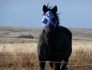 Andy is almost 25 now and loves to be groomed and pampered. But in the summer of 2009 a malignant carcinoma was found between Andy's right eye and his skull. Kelly does everything possible to keep her horse comfortable as long as possible. The black gelding wears a flymask all the time, but as Kelly explains, "the prognosis is not good. The tumor can go into his brain and make him neurological."