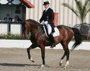 Ulla Salzgeber and Herzruf's Erbe finished third with 70.042%. The trot extensions were conservative, lacking overstep and there was some loss of rhythm in the first piaffe. During the entire ride one got the impression that all the qualities were there to score big, but it just didn't come totally together today. The tempi changes were all good, but in the two's the hindquarters swung to the right. He was also crooked to the right on the center line leading up the pirouette right. The piaffe and passage were good in its basic quality but the transitions appeared a tiny bit hesitant. We're sure that all pieces will fall in place for this come-back pair later this season.