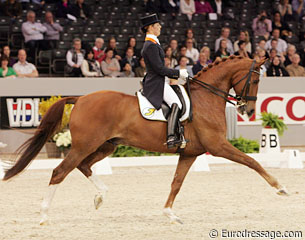 Dutch Imke Schellekens-Bartels had the ride of a lifetime on Sunrise, presenting her mare at peak performance and scoring 74.893% to finish third. Schellekens played it clean and safe and was mistake-free. Her bay Hanoverian mare lacked some oomph in the extended trot but the half passes were light footed and elegant. The mare kept a good rhythm in the piaffe and the extended walk had super overtrack and stretch in the neck. The highlight of her ride was the very well controlled zig zag. The tempi's were uphill and ground covering. In the left ones there was slight swing to the left but the one's were straight as a die. The weak point of this high quality ride was the passage. Even though it was very well controlled and regular, the hind legs were always trailing as the mare hollowed her back. Her swooshing tail is a distraction. Nevertheless, Schellekens produced a top level test worthy of the third placed Dutch rider for the 2010 World Cup Finals. Sunrise was elegant and Imke maintained a steady contact with the bit.