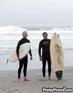 Phelps added that "after a fabulous week in southern California covering the Dressage Affaire CDI and the Para Dressage Olympic Qualifiers Guenter Seidel and David Blake invited me to join them Monday morning for coffee at “The Pipes Café” and then off to the beach to catch some waves. This is all part of their serious dressage training for the California based high performance dressage trainers who both have a successful show. The waves weren't that big while I was there so we'll try again this afternoon but I couldn't wait to show you these pics."