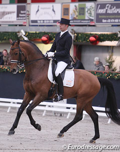 Spanish Severo Jurado Lopez became the runner-up aboard Gert Jan van Olst's dark bay dressage star Chippendale (by Lord Leatherdale x Negro). The dark bay has a breath-taking trot with much power from behind, stunning self-carriage and grace. The horse showed little bending in the corners and circles though. The stallion is limited in walk. Though he has overtrack, the shoulder freedom is restricted and the clarity could be better. The canter is excellent with a quick and active hindleg. The horse seemed to get hot and the rider struggled with the transitions as well as with some collection as the dark bay got a bit sour looking. Chippendale was definitely one of the most talented dressage horses of the day but needs more work on relaxation and bend in the body. He got 7 for walk, 9.5 for trot, 8.5 for canter and general impression. He totalled 83 points.