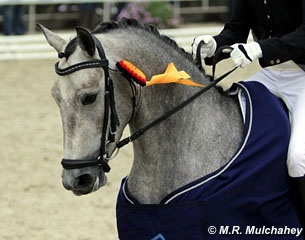 The 4-year old mares and geldings pony class was won by Lettenhofs Easy Finish with a score of 8.58. The pleasing grey gelding by Dörnberg's Erimon II x Renoir I won on the strength of his rideability and correct training. Ridden by Annkatrin Anselstetter, he scored 9.5 for harmony and 9.0 for training. He presented three correct and quality gaits. Following closely on the heels of Lettenhofs Easy Finish was Golden Graciella WE, scoring 8.33. The Hesselteich's Golden Dream x Black Boy palomino mare put in a similar ride to Lettenhofs Easy Finish, showing three solid gaits and very good training. Again, the real strength of this mare, ridden by Kirstin Klepin was the training and harmony, scoring 8.5 for training and 9.0 for harmony.