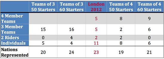 In the table I show these scenarios, I have assumed in all cases that Brazil, the Host Nation, sends a 3-member team. For shorthand I refer to the different scenarios as 50&3 (50 riders, maximum of 3 per nation), 60&3, 50&4, 60&4.
