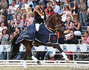 Heiner Schiergen's 16-year old student Anna Christina Abbelen dominated the field in the junior riders' division with two victories in the team championship test (74.414%) and in the kur (80.350%). Only in the individual test, Abbelen and her cute black gelding Furst on Tour (by Furst Heinrich x Rubioso N) had to let silver medal winning Claire Louise Averkorn on Condio B (by Contendro x Willems Ass) go ahead of her. Trained by German pony chef d'equipe Connie Endres, Averkorn posted scores of 72.703%, 75.439% and 77.275%. Joline Thuning, who was not a member of the German team at the 2013 European Junior Riders Championships, outmaneuvered several more experienced riders to end up on the bronze step of the podium. Aboard Don Dayly (by Depardieu x Don Primero) she stayed quite far behind the second placed rider but her scores of 70.180%, 71.535% and 74.875% sufficed for bronze. Big absentee at the Championships was 2013 European Junior Champion Johanne Pauline von Danwitz on Habitus.