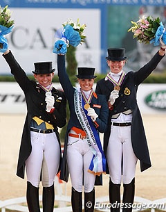 Belgian Jorinde Verwimp found a "bronze lining" to a difficult week of competition at the Europeans. On the day of the vet check, her horse jumped on her toe and fractured her left big toe. Verwimp, who trains with Anky van Grunsven, ignored the pain and rode with full dedication. A bronze team medal was certainly in reach had the judge at C not made a mistake during team mate's Alexa Fairchild's ride (the fences were blown over by the way. In principle the competition had to be stopped to have that fixed first, before Fairchild would start her ride). Verwimp give it her all in the Kur and rode to funky and fun Motown music which becomes her tall Dutch gelding Tiamo (by Lester x Hemmingway). Verwimp rode a nice combination of trot lengthenings, shoulder in and half passes. The transition from canter to trot was difficult. Verwimp scored 75.425% and ended up with bronze as several other medal candidates were unable to stay fault free. Verwimp is the first Belgian young rider ever to take an individual medal. Now Grand Prix rider Vicky Smits won individual silver as a junior rider at the 1996 European Championships in Helsinki.