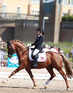 Danish team mate Louise Christensen produced the superior ride of the day on the 12-year old gorgeous pony Vegelin's Goya. This chestnut eye-catcher is up in the frame and bridle throughout the test and soft in the contact. The first trot extension and both half passes were a highlight. The collected walk in between the walk pirouettes was tense and the walk part after the diagonal was lateral. The end halt was not square but the entire canter tour was extremely well ridden. Christensen scored a well-earned 73.487% which ranked them first provisionally and brought Team Denmark into the lead.