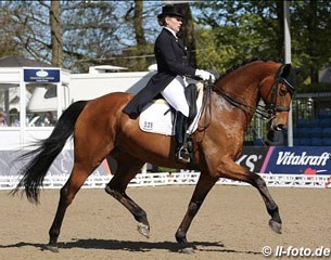 Hubertus had opted for Ganda as the Derby horse and rode the Special with her, but got eliminated for blood on the right flank in the spur area. With Mefisto, who had just returned from an injury and for whom the derby finals would be too strenuous, he rode and won the Kur to Music with 77.000%. Because the kur does not count for the Hamburg Dressage Derby process and as he withdrew Ganda from the Derby Finals, the Hamburg show organisation also disqualified both horses from the Grand Prix results list. Nathalie zu Sayn-Wittgenstein and her Danish bred mare Fabienne (by Future Cup x Rubinstein) replaced Schmidt as third highest scoring pair in the two Derby rounds.