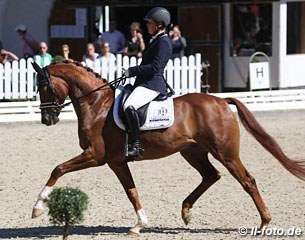 The 5-year old division featured just three horses and was judged by Michael Hubrich and Christiane Plewa. Carde Meyer steered the Hanoverian mare Surabaya M (by San Amour x Davignon) to victory with an 8.0 total. The black mare for 7 for walk, 8.5 for trot, 8 for canter and submission and 8.5 for general impression. Kim Pfeiffer and the Wurttemberger bred stallion Jackpot HS (by Johnson x Dr. Jackson D) were second with 7.4.