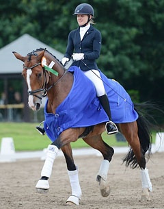 Christina Konings and the Hans Jurgen Briem's Rhinelander mare Lassira B (by Lissaro x Lancer II) won the M-level dressage horse test for 6-year olds with a total of 8.0. The bay mare earned 8.5 for walk, 8 for trot, 7.5 for canter, and 8 for submission and general impression. Katharina Hartmann and Best Babiacki's Rhinelander stallion Serano (by Son of Coligne x Donnerschwee) finished second with 7.4. The black stallion got 8 for walk, 7.5 for trot, 7 for canter and submission and 7.5 for general impression.