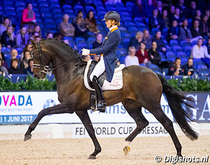 Edward Gal and the Austrian owned 15-year old Dutch warmblood stallion Voice (by De Niro x Rohdiamant) finished fourth. Gal rode very expressive trot extensions with his black stallion. The half passes had very good crossing but in the right one Voice needed to be more up in the bridle. The horse's mouth was quite unsteady with tongue showing more than regularly. The passage has nice suspension and the collected walk was very good. The piaffes were the problem today with all three of them not being correct: Voice back steps with the hindlegs, moving them out from under the body each time, even though Gal does hit best to keep a steady rhythm going. In the second one the horse also hollowed the back and came to high in the bridle. The transition to canter was croup high, yet the zig zag was well ridden and there was much ease in the tempi changes even though the horse swung to the left in the two's. The right pirouette was slightly big. Gal finished with strong passage work on the last centerline, but the transition out from piaffe was too big a step. He scored 74.680%.